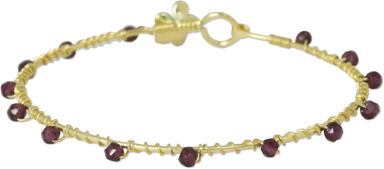 Handmade Gold Plated Garnet Bangle Bracelet Floral from Thailand Red Tone Birthstone [7.5 in Inner Circ. 4 mm W] ‘Floral Berries’